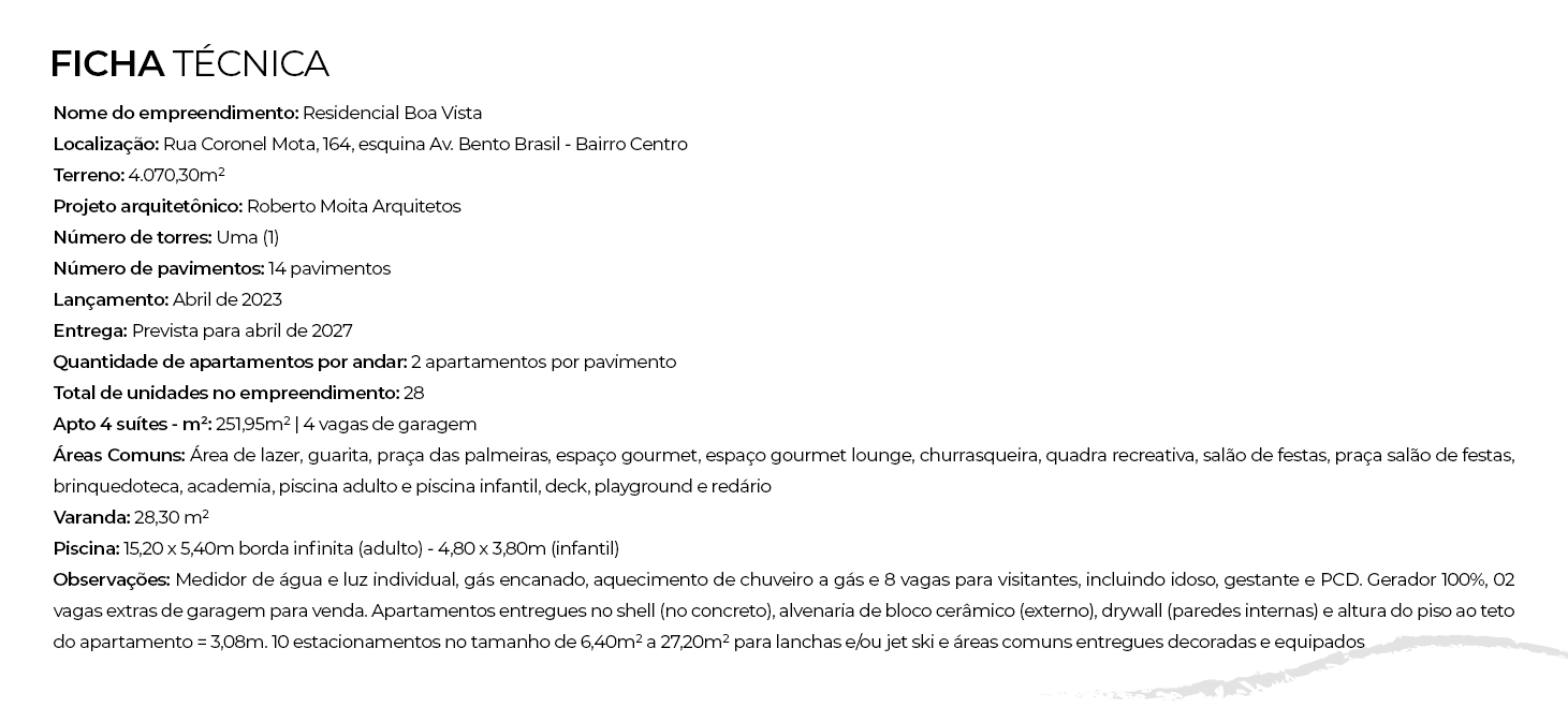 Incorporadora: Rio Branco Negócios Imobiliários SPE LTDA. Empreendimento registrado sob o R5 da Matricula n°52303 do Registro de Imóveis de Boa Vista – RR. As perspectivas e plantas são meramente ilustrativas. Os móveis e utensílios são de dimensões comerciais e não serão entregues. As medidas internas são de face a face das paredes. Acabamentos, conforme Memorial descritivo do empreendimento. O empreendimento está localizado na Rua Coronel Mota, n° 164, esquina com a Av. Bento Brasil – Bairro Centro. Impresso em Março/2023